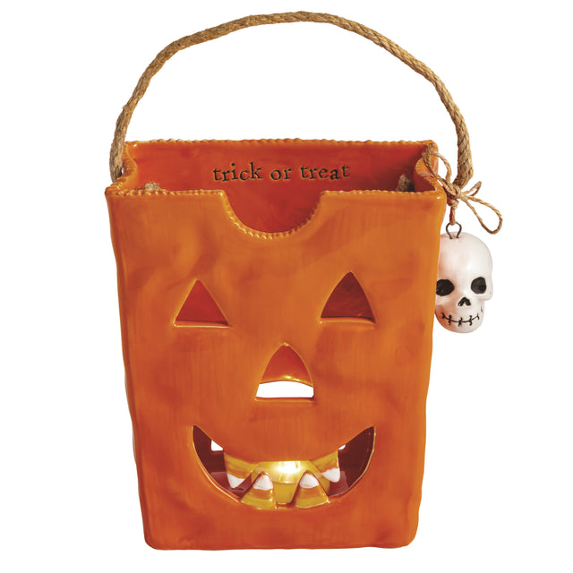 Mottled ceramic treat bag lantern with jute handle. Comes with flameless tea light. Battery included.