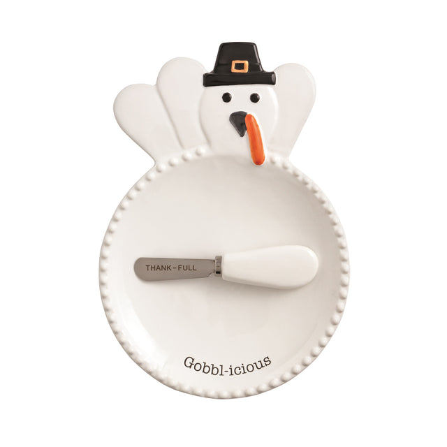 2-piece set. Ceramic turkey plate with hand-painted details features groove at feathers to hold included stainless steel spreader.