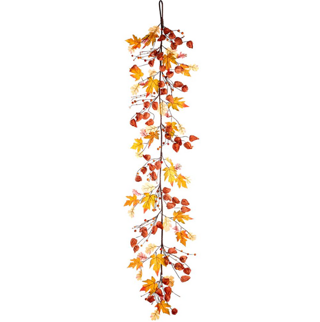 Experience the vibrant colors of autumn with our 72" Chinese lantern and maple garland. This festive decoration combines bright gold and rust orange maple leaves for a cheerful celebration of the season. Add a touch of fall to any room in your home.