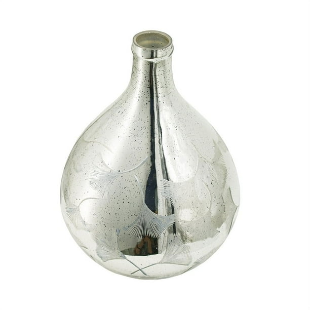 Add a modern focal point to any room with this shiny antiqued vase. The glass vase features a narrow mouth and round design. It's finished with an abstract metallic leaf and flower pattern. Add faux botanicals or display it on it's own for a beautiful touch.