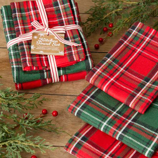 Add a touch of festive charm to your kitchen with this set of 3 heavyweight kitchen towels in a classic boughs of holly plaid design. Made from durable and absorbent cotton, these towels are perfect for drying dishes, wiping up spills, or simply adding a touch of holiday cheer to your kitchen decor. The set includes three coordinating towels, each featuring a different pattern in shades of green, red, and white.